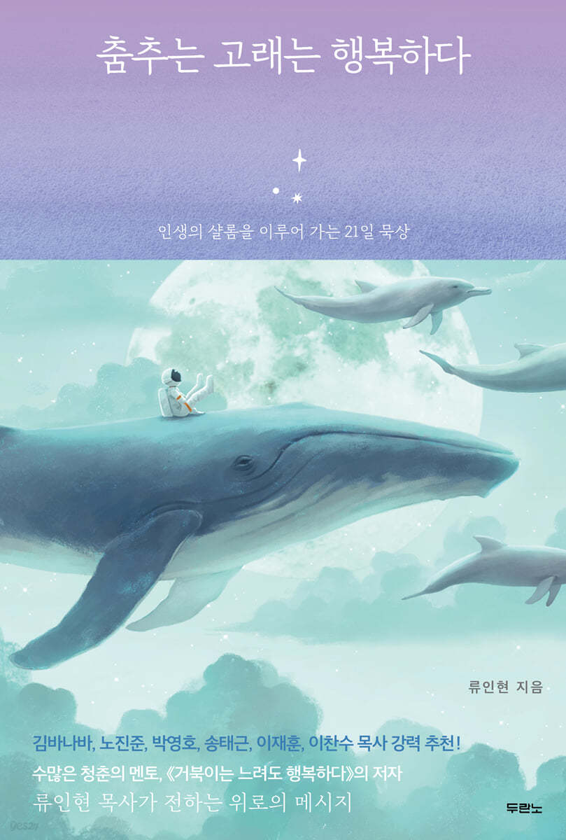 | 약육강식, 승자독식의 세상 속에서 조금은 느리더라도 함께 춤추며 노래하는 행복한 세상을 꿈꾼다 김바나바, 노진준, 박영호, 송태근, 이재훈, 이찬수 목사 강력 추천! 『거북이는 느려도 행복하다』의 저자 류인현 목사가 전하는 위로의 메시지 혹등고래는 다른 고래들보다 느리다. 하지만 춤을 즐기고 노래를 많이 부른다. 이들이 춤추고 노래를 부르는 이유에 대해서는 아직 정확하게 밝혀진 바가 없다. 혹등고래는 그 거대한 몸집만으로도 경이로움과 두려움을 느끼게 하지만, 사실 ‘바다의 수호천사’로 불릴 만큼 착한 성격을 가졌다. 바닷속 작은 동물들을 큰 동물들에게서 보호해 주기도 하고, 바닷속을 탐험하는 사람들에게 신호를 주어 위험한 곳에서 벗어날 수 있게끔 도와주기도 한다. 그뿐인가? 혹등고래는 그 거대한 몸집으로 먹고 싸면서 바다의 유기물을 순환시켜 해양 플랑크톤의 광합성을 돕기도 하고, 죽고 나면 사체가 바다 밑바닥까지 가라앉아 심해 생물들에게 먹이를 제공한다. |