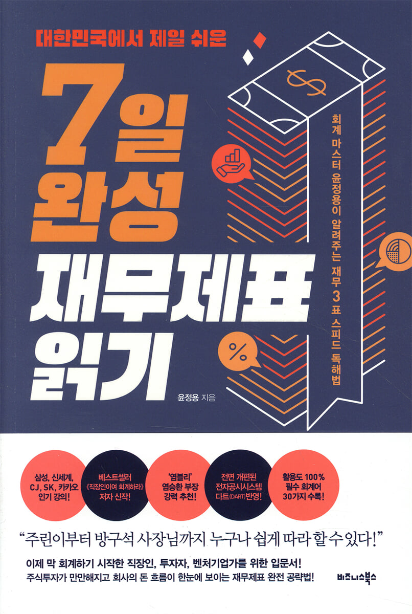 이 책은 회계 비전공자로 삼성그룹 재무팀에 배치돼 고군분투 끝에 회계 마스터로 거듭난 저자의 ‘7일 완성 재무제표 독해법’ 정수가 담겨 있다.