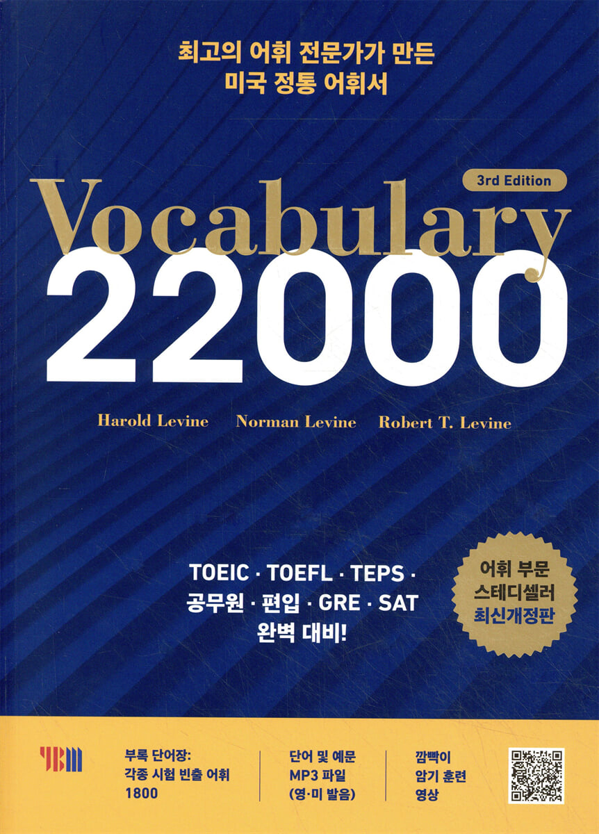 미국 전문가들이 만들었습니다.Vocabulary 22000 3rd Edition은 영어의 본거지인 미국에 소재하는 대학교, 고등학교 교사 등 어휘 전문가들이 단어를 선별하고 그 학습법을 제공하여 교재에 대한 신뢰도를 높였습니다. TOEIC, TOEFL, SAT, GRE, GMAT를 공부하는 학생들에게는 더욱 좋겠지요?