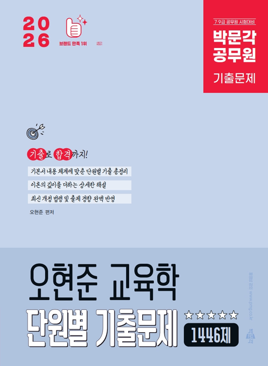 « 2026 Park Moon-gak Civil Servant Oh Hyeon-jun Education Unit-by-Unit 1446 Past Exam Questions » est un recueil de questions d'examens antérieurs destiné aux candidats préparant les concours de la fonction publique liés à l'éducation, tels que les concours d'administration et de spécialiste de l'éducation de niveau 7 et 9, les concours de recrutement d'enseignants et les promotions d'agents administratifs de l'éducation de niveau 5. Il est organisé comme suit.