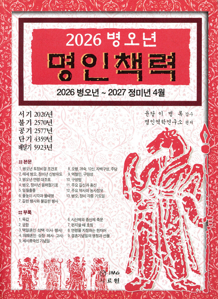 Le 『Livre des changements de l'année Byeong-o 2026 de Myeong-in』 publié par l'Institut de divination de Myeong-in a été supervisé par M. Lee Byeong-rok de Yundang et supervisé par M. Kim Cheol-hoe de Jisong et M. Kim Du-jeong de Myeong-in. Il couvre un total de 16 mois jusqu'en avril de l'année Jeongmi 2027, et comprend : ▷Tojeong Bigyeol Jogyeonpyo, ▷Un nouveau tableau des directions, ▷Un tableau de comparaison des âges, ▷Les heures de lever et de coucher du soleil, ▷Le niveau de l'eau et le nom des marées, ▷Les événements propices et néfastes, ▷Les cinq éléments, les 28 constellations, les 12 dieux, la composition de Jabak, Judang, ▷Yeokhyeol-in, Gurangseong, ▷La méthode de composition, ▷Les principaux dieux propices et néfastes, ▷Les principaux pharmaciens et informations agricoles, ▷Différents jours de prière pour les années Byeong-o et Jeongmi, etc., organisés de manière claire et compréhensible.